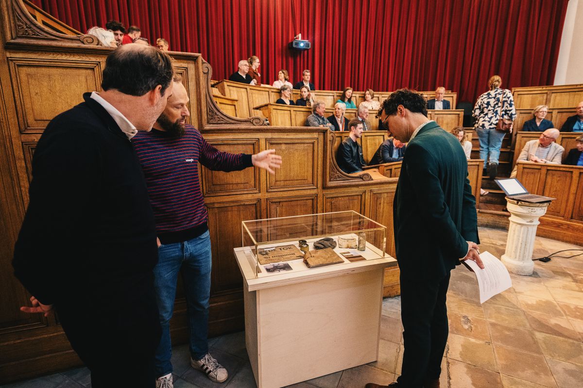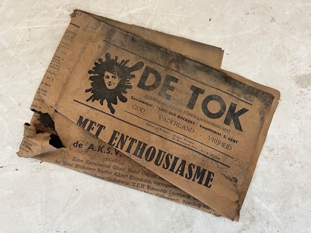 Bij de werken doken er ook onverwacht schatten op tussen en onder de studentenbanken. Een krantje uit lang vervlogen tijden, een half vergane studentenpet, een inktpot… Of hoe ons gebouw op alle mogelijke manieren de verbeelding blijft prikkelen.