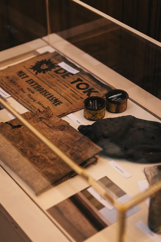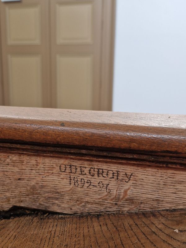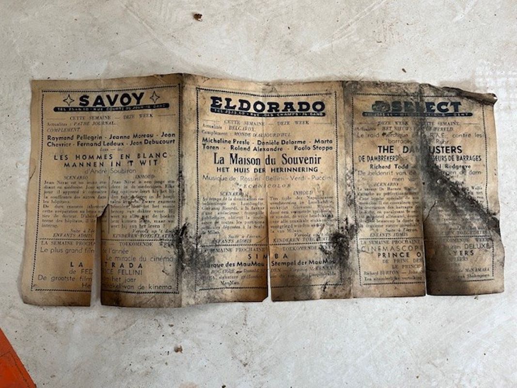 Bij de werken doken er ook onverwacht schatten op tussen en onder de studentenbanken. Een krantje uit lang vervlogen tijden, een half vergane studentenpet, een inktpot… Of hoe ons gebouw op alle mogelijke manieren de verbeelding blijft prikkelen.
