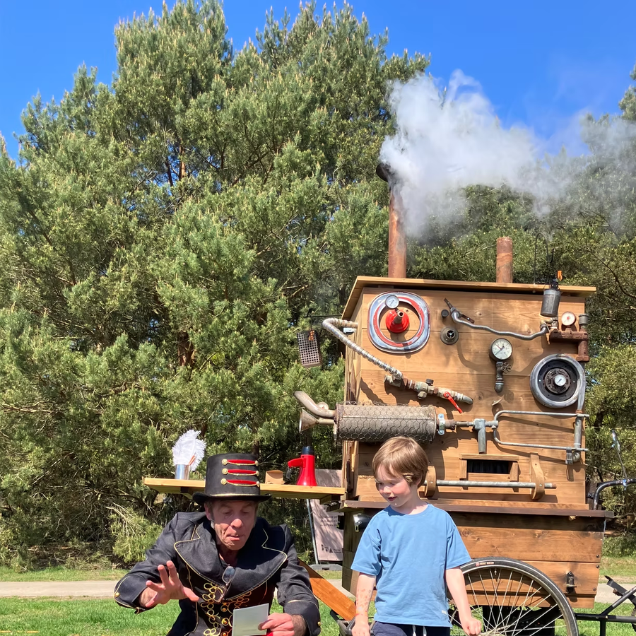 Fabriek Majestiek van Straattheater Bonpardon geeft kinderen en volwassenen de kans om hun grootste wens te delen. Met wat tandwielen, een grapje van de fabrieksbaas en een vleugje magie produceert de bakfietsfabriek een pittoresk gedicht. Deel de wens met wie je wilt: met een rijmpje hier en een grapje daar komt de wens nog waar!
