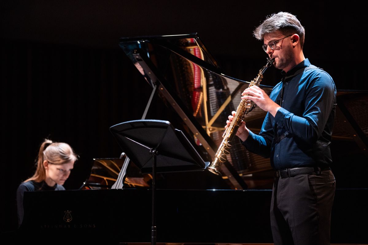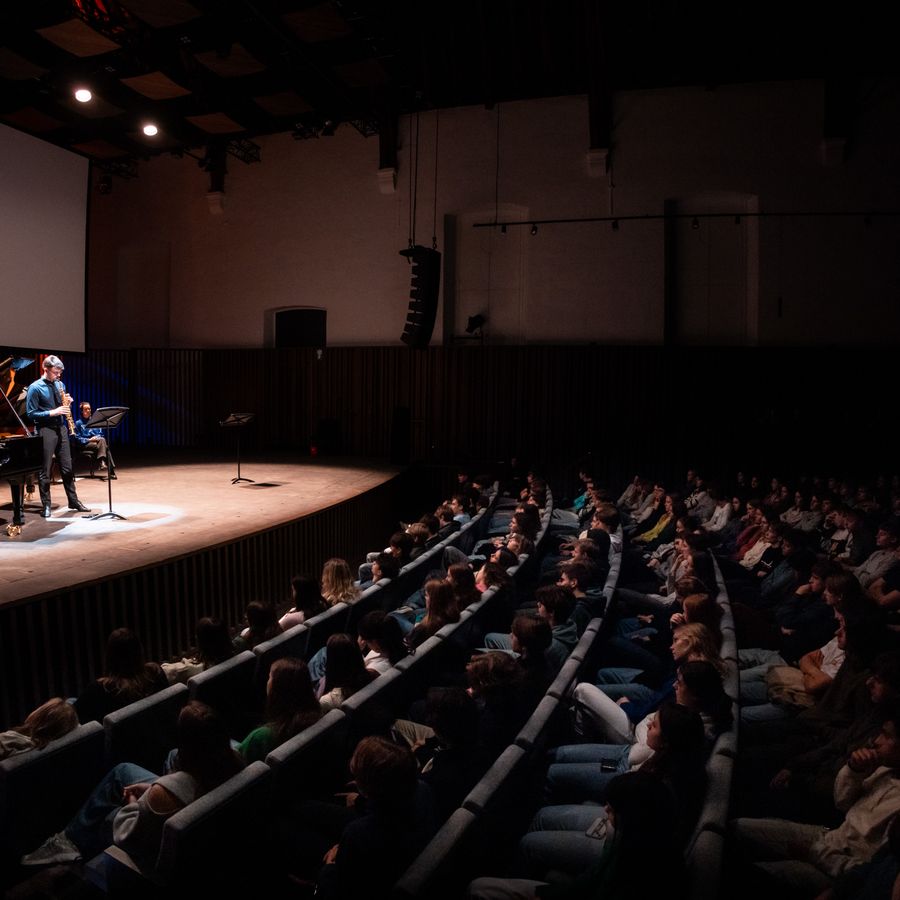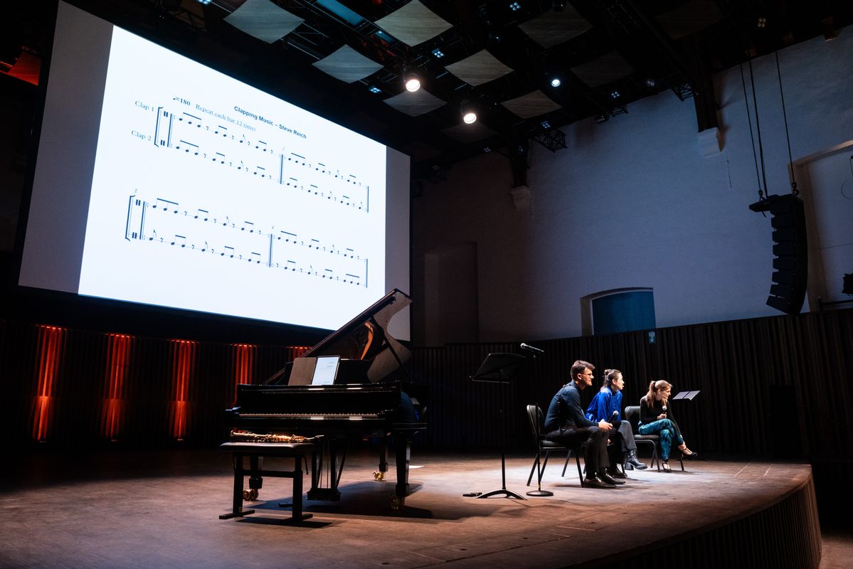 Aan het eind van het concert gingen de leerlingen ook zelf aan de slag. Samen met Maarten voerden ze (een stukje van) Steve Reich's 'Clapping Music' uit.