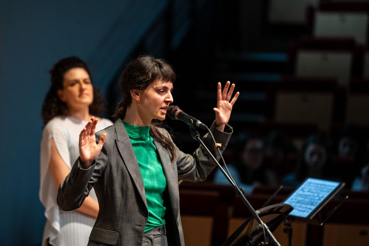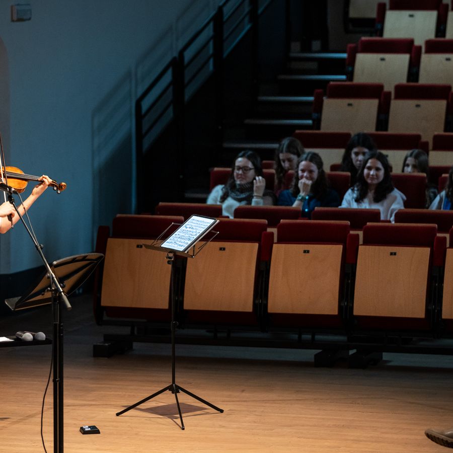 Met haar viool in de hand en ‘klassiek’ uitgedost komt violiste Liza Ferschtman woordeloos het podium op, Vanhoutteghem volgt in haar voetsporen. Ferschtman begint meteen Bach te spelen, de ‘Prelude’ uit ‘Partita nr. 3’. Veel leerlingen weten zich niet meteen een houding te geven – je hoort ze bijna denken: cringe. Vanhoutteghem haakt wat later in en vuurt een eerste verbaal salvo af. Met haar armen dirigeert ze haar woorden.
