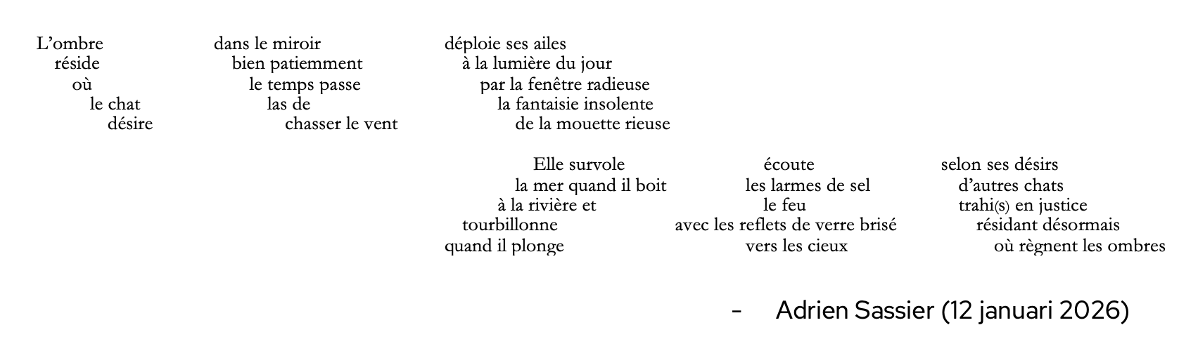 In dit symfonische gedicht ontvouwt zich een verhaal over de merkwaardige relatie tussen een slechtziende kat, verbeeld door de strijkers, en een lachende meeuw in de houtblazers. Het stuk wil eer betuigen aan de Duitse romantische muziek met verwijzingen naar o.a. Wagner, Strauss en Mahler, door de lens van een postmodernistisch, Frans oog. Een creatie die klinkt als een surrealistische droom.